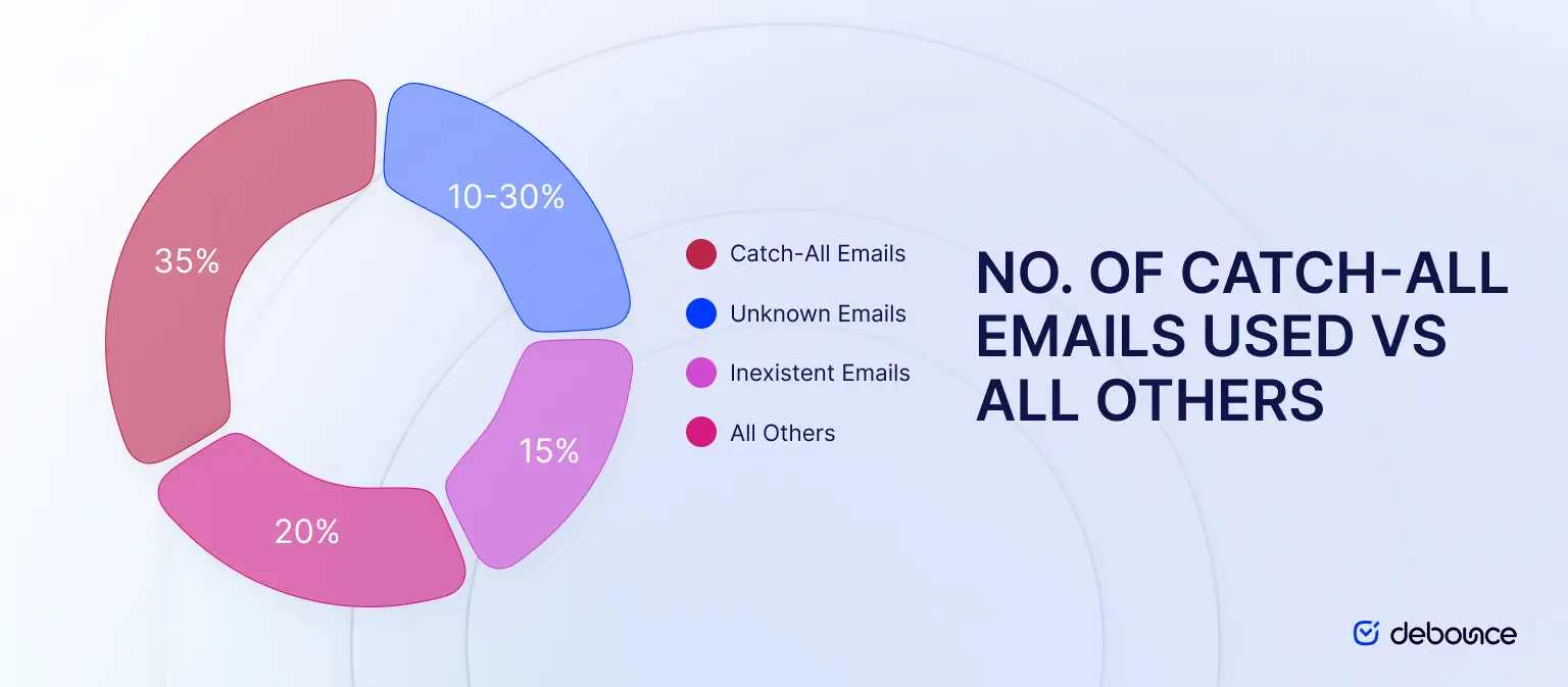 Catch-all emails are quite common, with 10-30% of all emails being catch-all emails, according to DeBounce. This means that for every 100 emails sent, 10 to 30 of them will be sent to a catch-all email address.