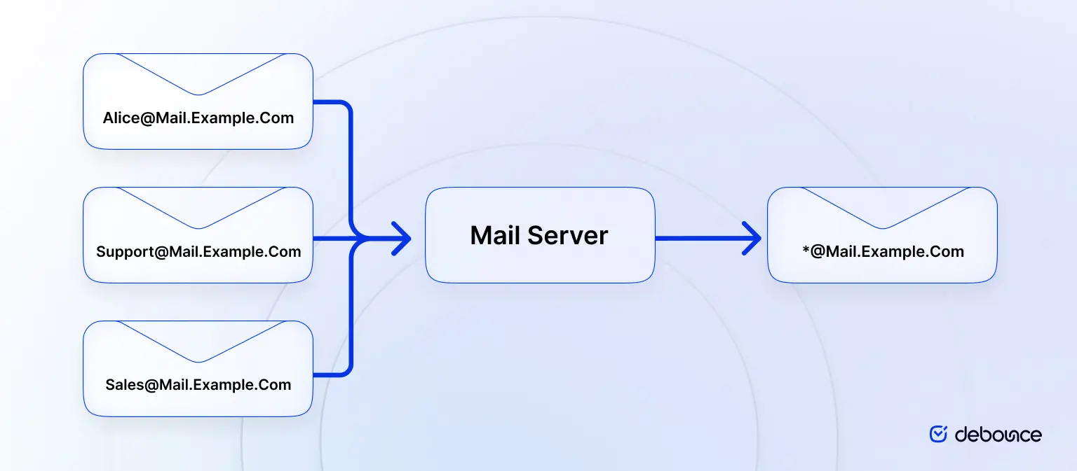 Catch-all, also known as “accept-all” is a domain-wide setting mail server that is configured to accept all emails sent to the domain, no matter if the specified mailbox exists or not.